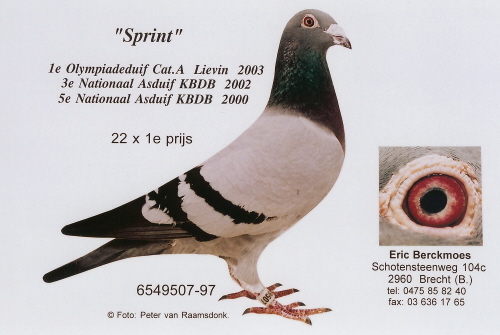 健将号“Sprint”,砂眼、灰、雄,环号B97-6549507。由Marcelis·A( 阿尔伯特·马塞利斯)作出,马塞利斯系血统。