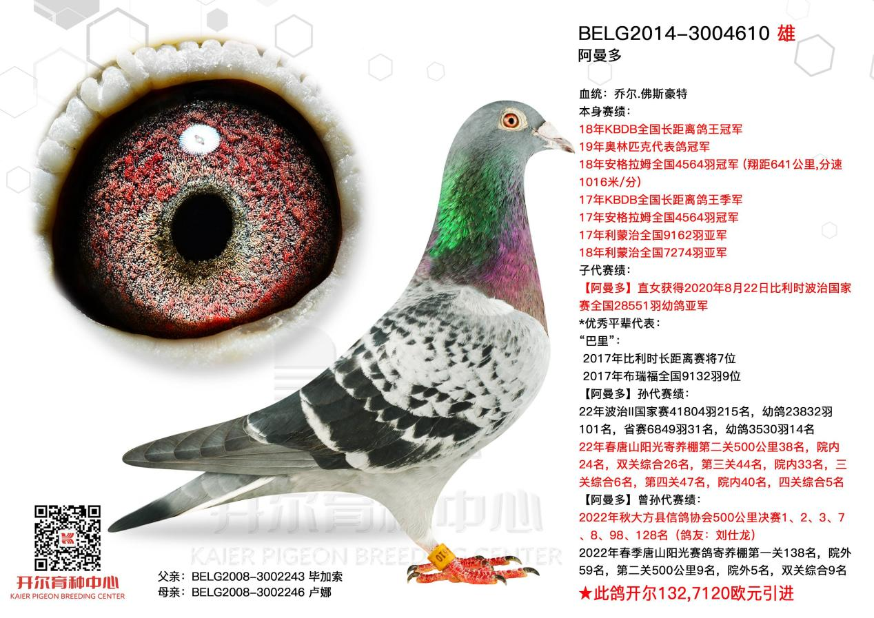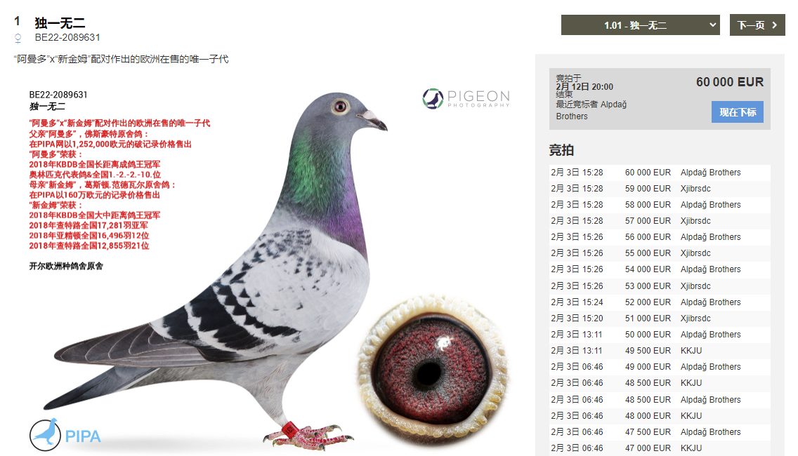 一提到阿曼多,很多鸽友可能首先想到它的创纪录身价,以及它的满身荣耀!作为比利时历史上最优秀的当日归长距离赛将,【阿曼多】一直受到国内外鸽友的热捧,PIPA卧虎藏龙拍卖会上,开尔【阿曼多】x【新金姆】配对作出的欧洲在售的唯一子代【独一无二】上线仅一天,竞拍价格已高达60000欧元!