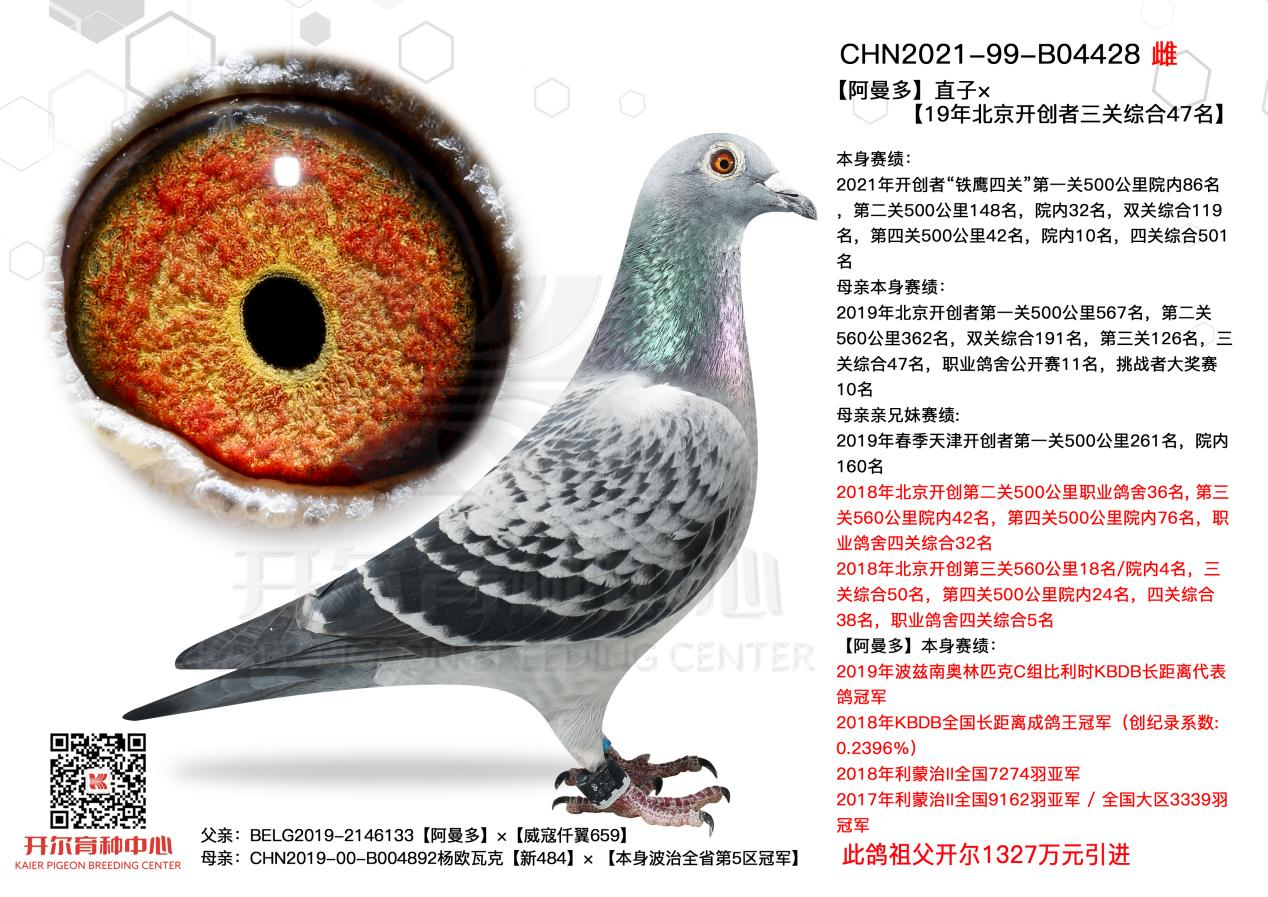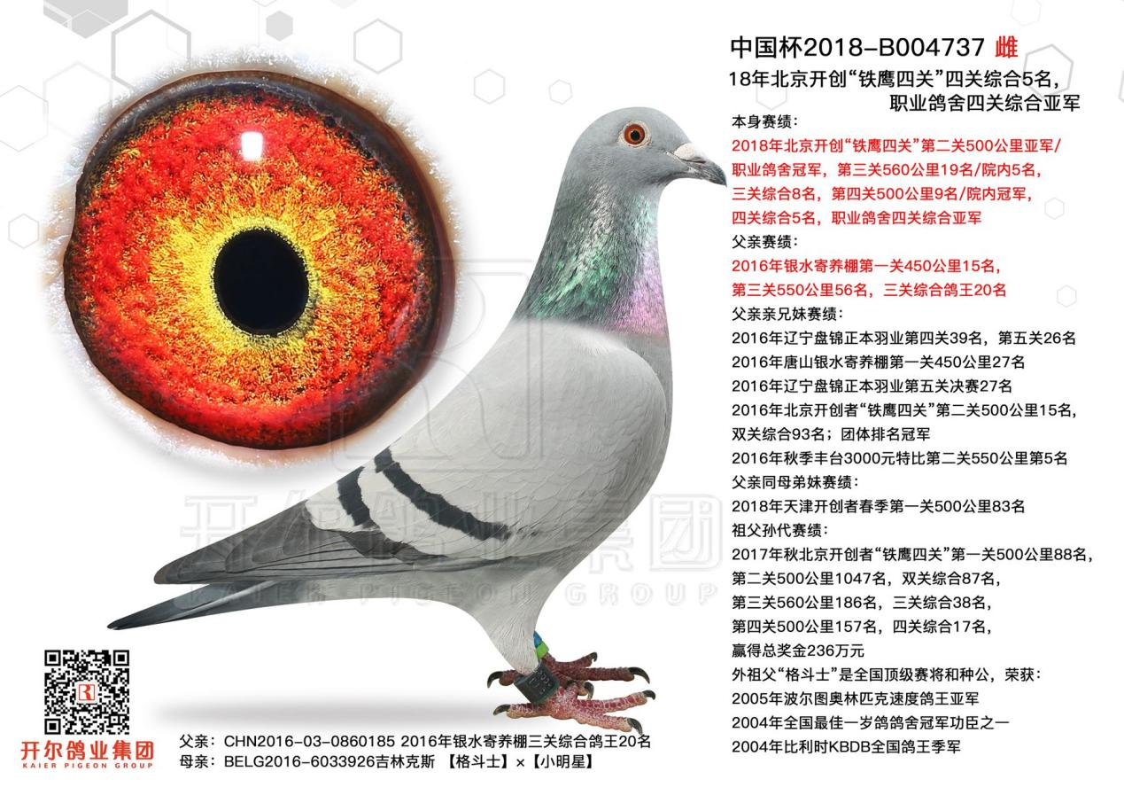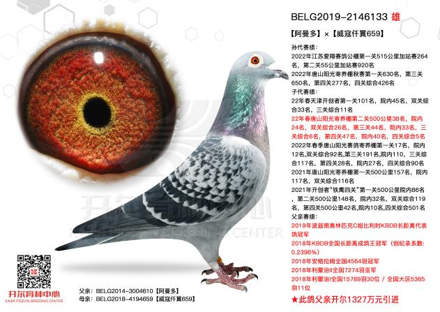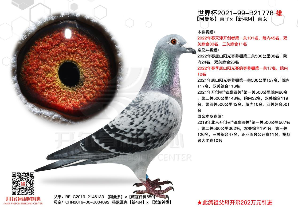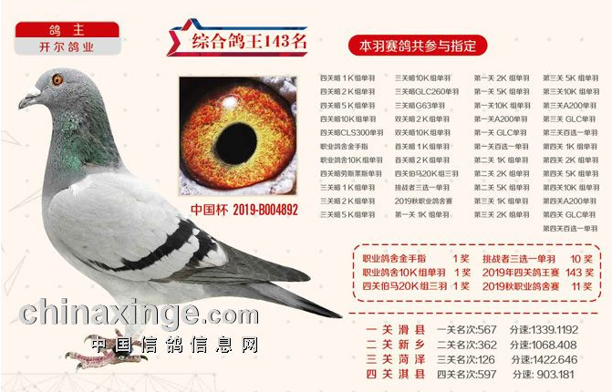 2146133出生于19年,2021年它和出自开尔经典配对的杨欧瓦克,2017年NPO全国长距离鸽王8位【新484】与本身波治全省第5区冠军【波治神鹰】,共同作育的B004892作育出了2021年开创者“铁鹰四关”第一关500公里院内86名,第二关500公里148名,院内32名,双关综合119名,第四关500公里42名,院内10名,四关综合501名!
