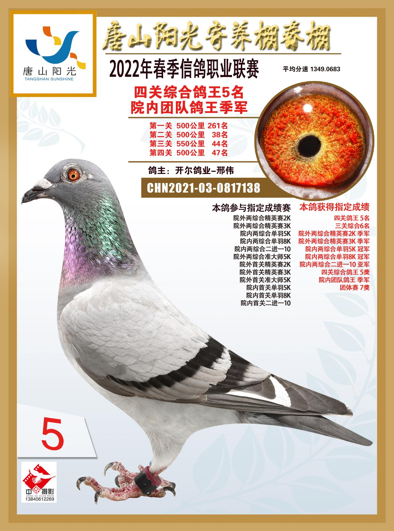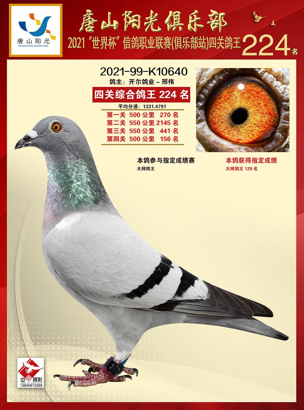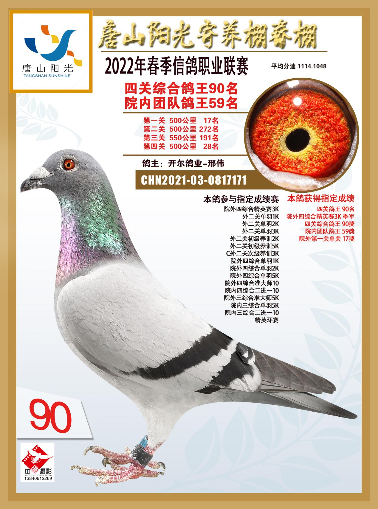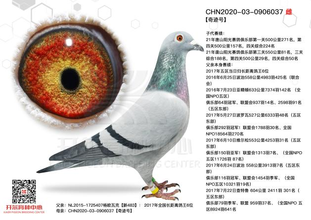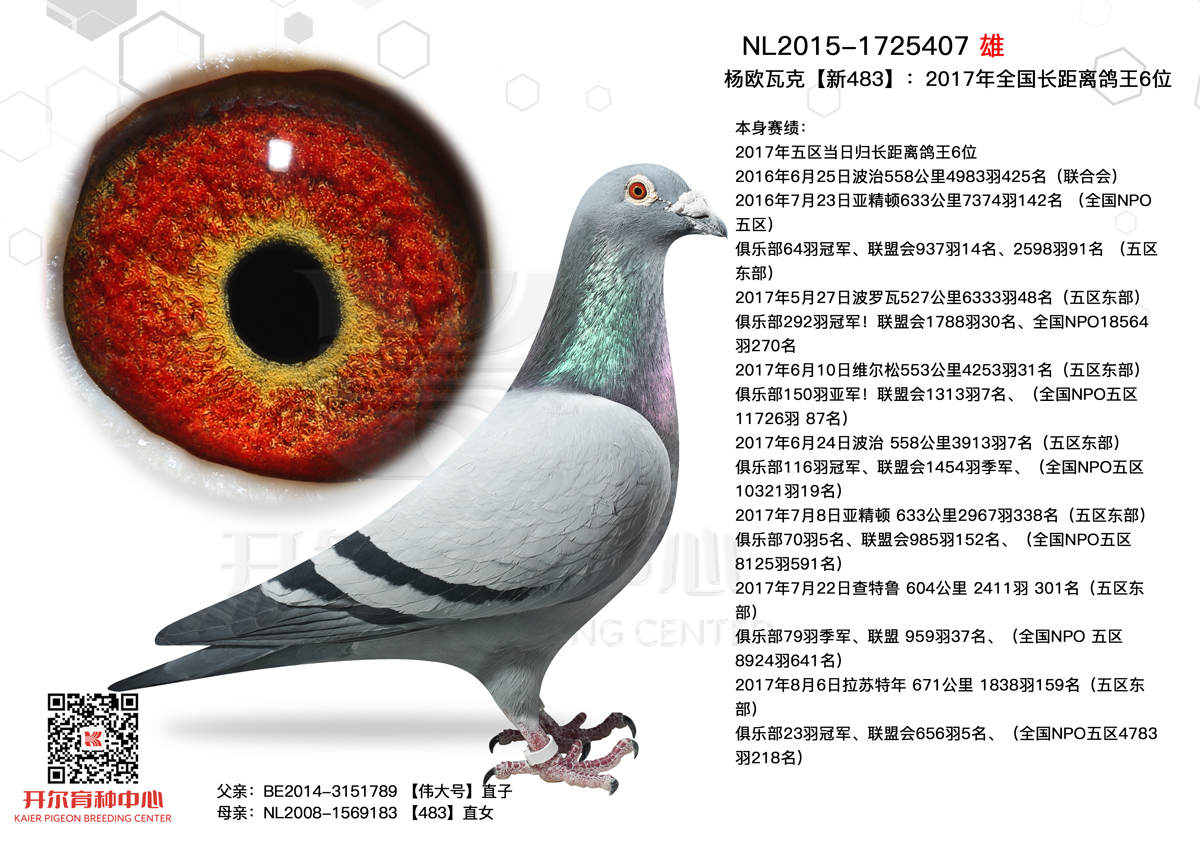 2146133出生于19年,2021年它和出自开尔经典配对的杨欧瓦克,2017年NPO全国长距离鸽王8位【新484】与本身波治全省第5区冠军【波治神鹰】,共同作育的B004892作育出了2021年开创者“铁鹰四关”第一关500公里院内86名,第二关500公里148名,院内32名,双关综合119名,第四关500公里42名,院内10名,四关综合501名!