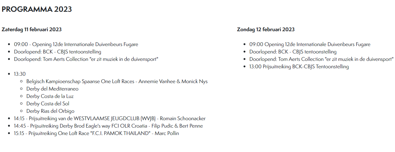 2023年比利时“FUGARE”国际赛鸽博览会将于2月11-12日,在比利时考特莱克市(Kortrijk)开幕,为期两天,入场费为10欧元,妇女和儿童免费。届时,将有来自比利时、荷兰、德国、英国以及波兰等15多个国家或地区、超100家参展商参展。