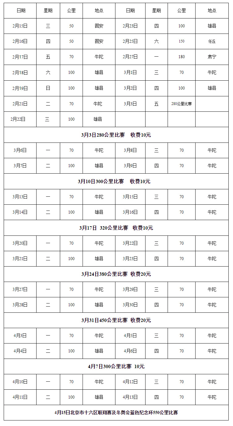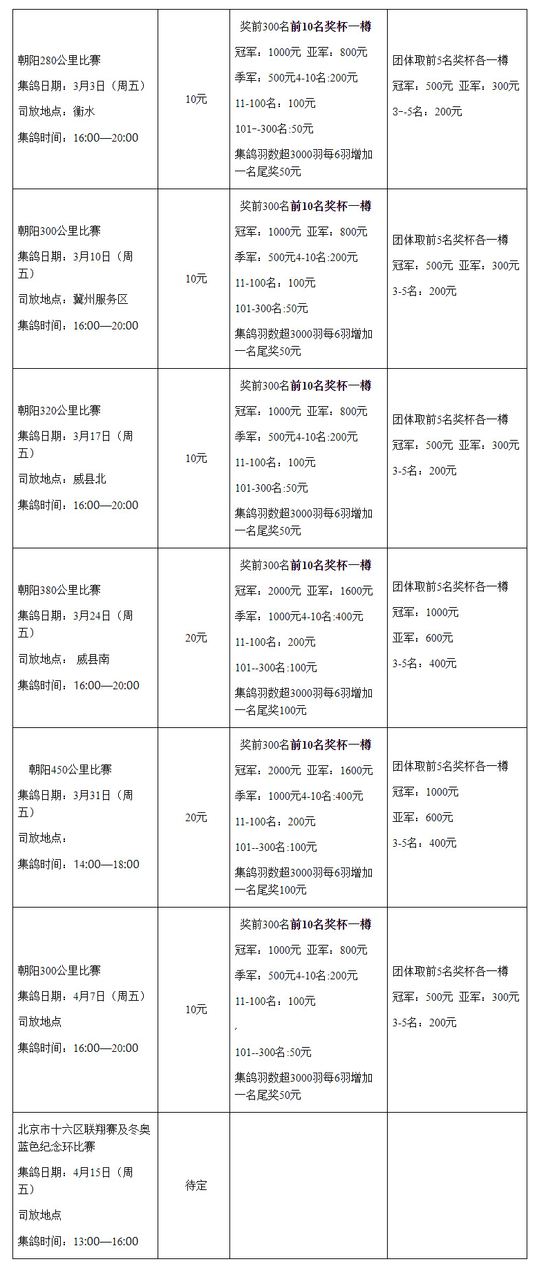 2月4日,北京市朝阳区信鸽协会公布2023年春季训放计划,拟定于2月15日开启春训,3月3日打响第一场比赛,4月15日奖打响北京市十六区联翔赛及冬奥蓝色纪念环比赛,一周一场短距离速度赛,节奏很快。