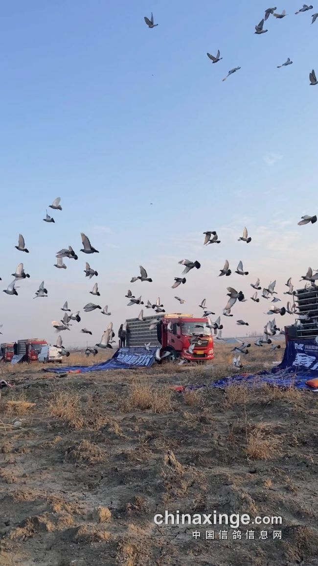 2月7日清晨7:51,第一车训放车缓慢开笼,首次训放的赛鸽们陆续飞出,有力地挥动着翅膀。由于是第一次训放,赛鸽们也在适应中,后面放飞的赛鸽在前面已出笼的赛鸽带动下,出笼状态越来越好,在空中稍作盘旋后,朝着公棚的方向飞去。