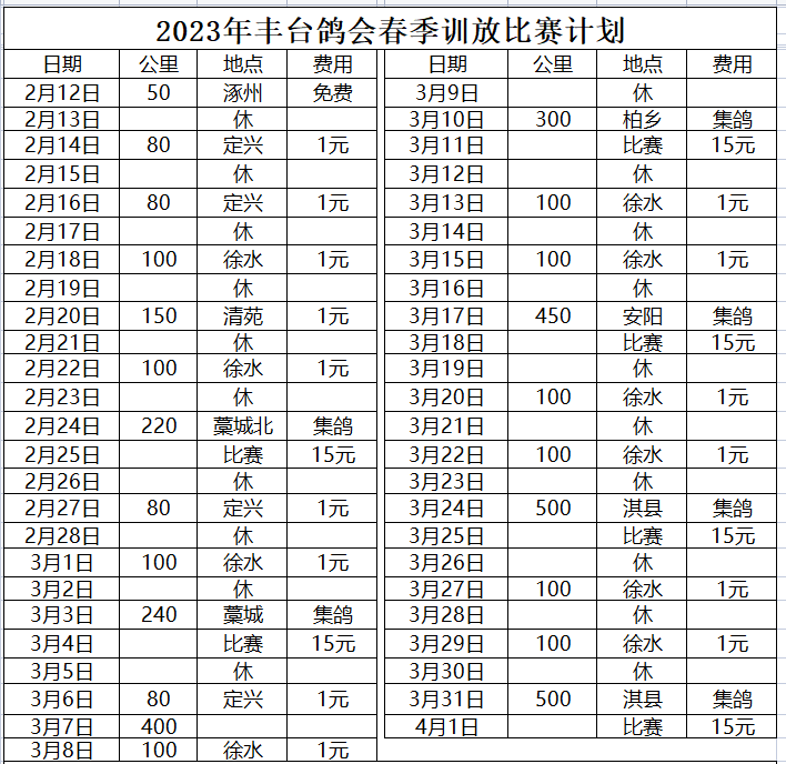 继北京市朝阳区信鸽协会、北京东西城区鸽会公布2023年春赛训放计划后,2月9日,北京市丰台区信鸽协会也公布了今年的训赛计划。拟定于2月12日开始第一场50公里免费训放,2月25日打响第一场比赛。4月16日进行联翔赛,4月29日和5月13日开展国家赛。
