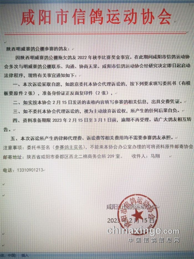 2月16日,陕西省咸阳市信鸽运动协会发布了一则维权公告:因陕西明威赛鸽公棚拖欠鸽友2022年秋季比赛奖金,经多次与公棚沟通协商无果,鸽会决定即日起启动法律程序。