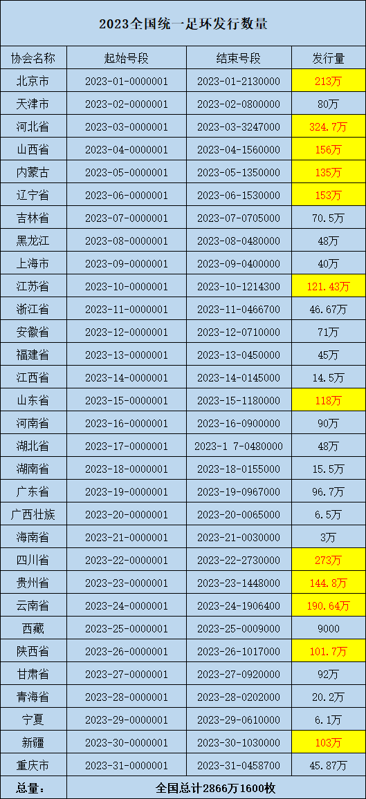 2023年全国足环发行量公布,31个省市自治区总计发行2866万1600枚,对比2022年2711万2500枚,增加了154万9100枚,仅低于2021年2875万的历史最高纪录。