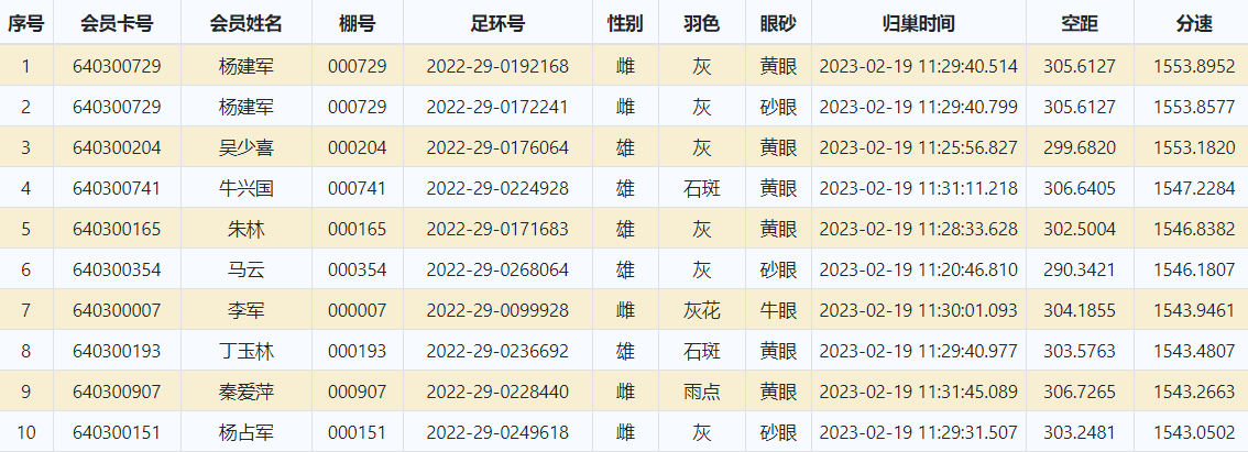 经过3个多小时的飞行,上午11:20,马云的2022-29-0268064砂眼雄鸽率先报进,分速1546.1807米/分,但空距仅有290公里,暂列比赛6名。3分钟后,杨建军环号2022-29-0192168、2022-29-0172241的两羽雌几乎同时到达,分别以1553.8952米/分、1553.8577米/分的成绩拿下冠亚军,空距305公里。吴少喜的2022-29-0176064灰雄以微弱差距获得季军,分速1553.1820米/分,空距299公里。