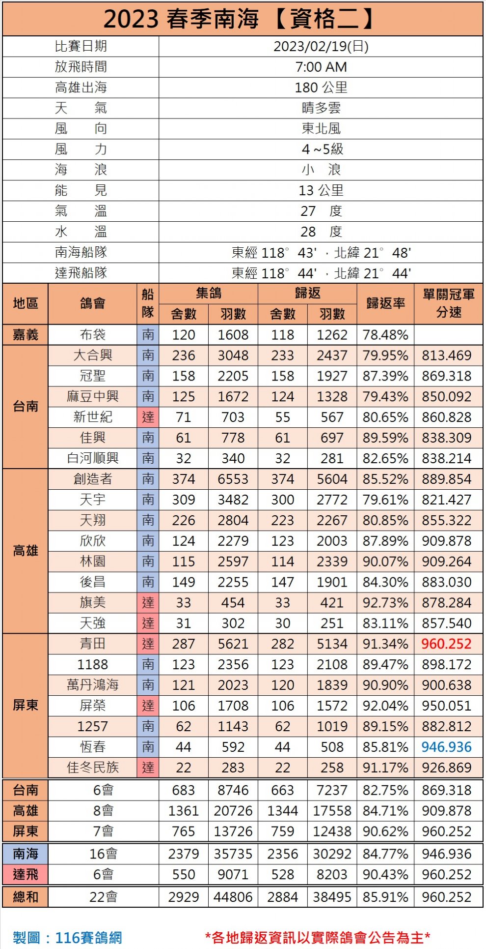 台湾南海春季海翔资格赛第二关,于2月19日进行比赛,出海180公里,早上7点整开笼。天空晴转多云,4-5级东北风,能见度13公里,小浪。比赛共计22家鸽会、2929家鸽舍、44806羽同场竞翔,最终归巢2884舍、38495羽,归巢率85.91%,单关最高分速960.252米/分。