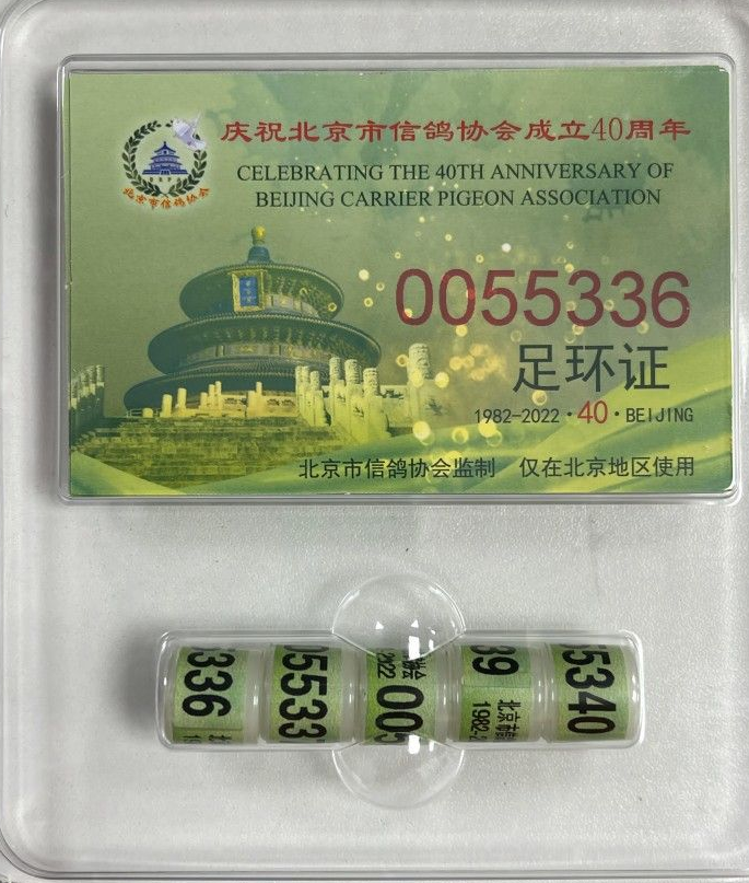 根据已公布的足环图片显示,足环以象征生机和发展的绿色为主色调,足环证上有北京市信鸽协会会徽,以及“庆祝北京市信鸽协会成立40周年”文字,足环上有唯一编号及北京市信鸽协会1982-2022字样。