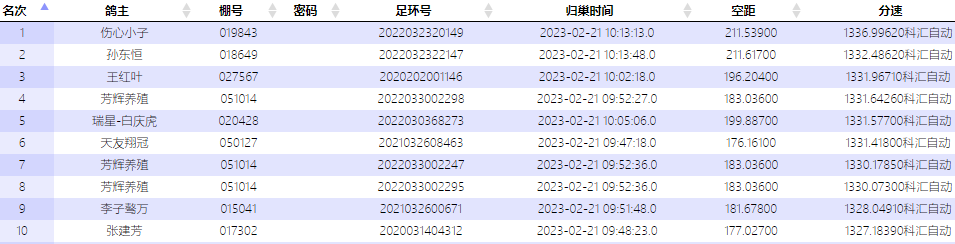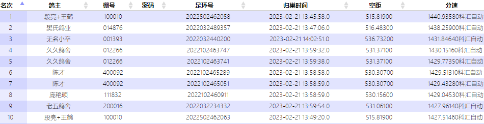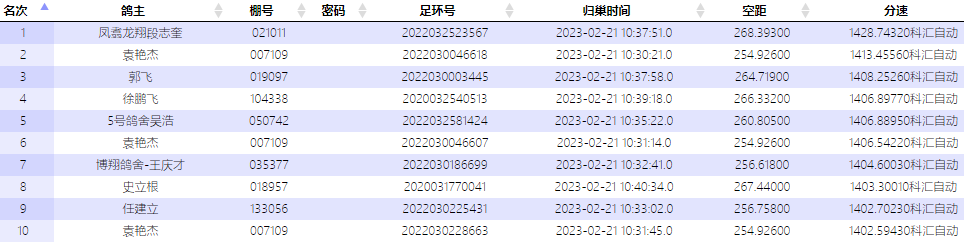 河北保定搏翼竞翔赛鸽俱乐部是河北地区内较早进入500公里级别赛事的俱乐部了,2月21日7:48,585羽进入黄岛服务区开笼放飞,经过半天的飞行,鸽友段亮+王鹤的2022502462058于13:45归巢,分速1440.9358米/分拿下冠军;亚军是樊氏鸽业的2022032489357;季军是一位名为“无名小卒”鸽友的2022032440200,15分钟之内百羽报满。截至2月22日早9:00,共有352羽赛鸽归巢。