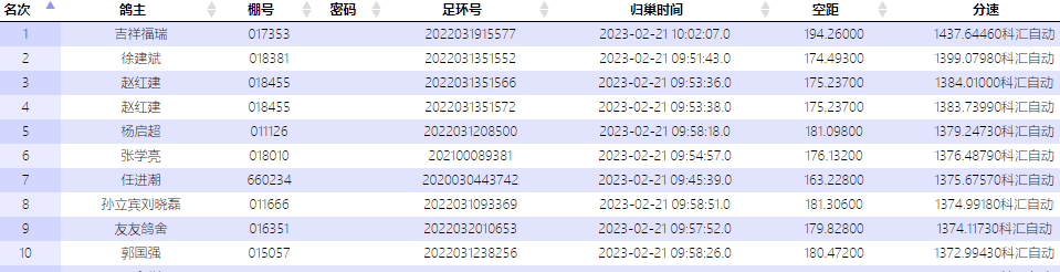河北肃宁冰城赛鸽俱乐部冰城240公里第一关于2月21日早7:30在大名服务区开笼,共2333羽赛鸽同场竞技。凤翥龙翔段志奎的2022032523567在飞行三个小时后归巢,以1428.7432米/分的分速拿下冠军;鸽友袁艳杰的赛鸽拿下亚军;郭飞的赛鸽拿下季军。截至2月22日早9:00,共有1991羽赛鸽归巢。