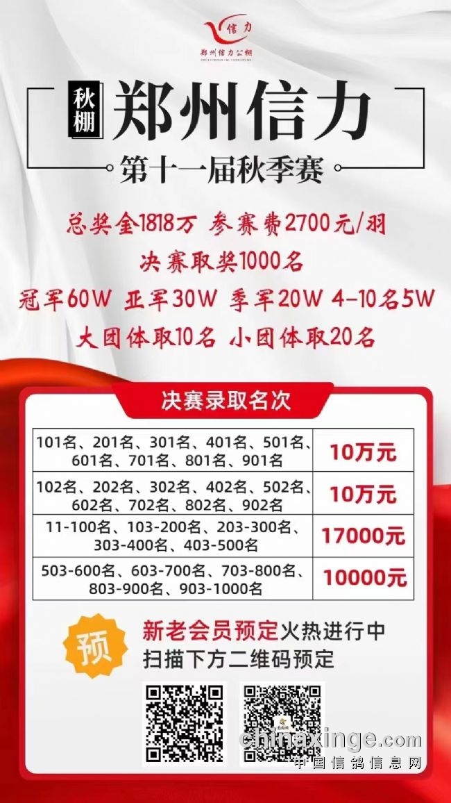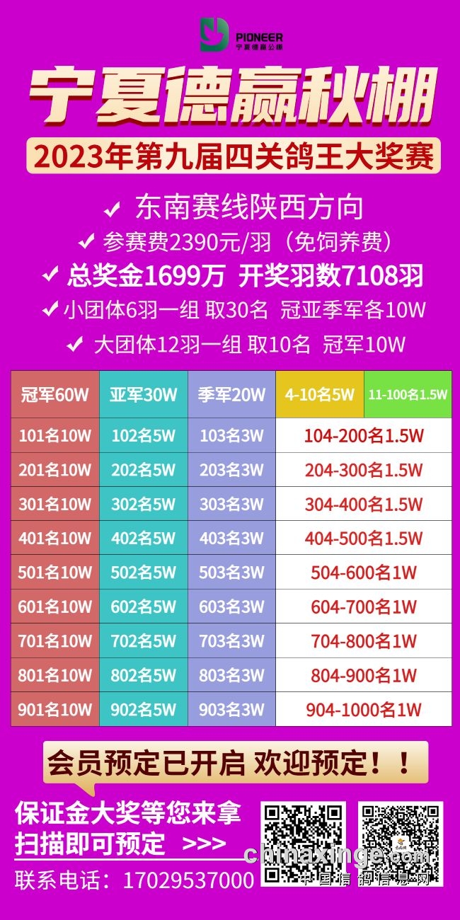 如今看到,宁夏德赢秋棚总奖金1699万,参赛费2390元,比率1:7.108,即7108羽参赛费保本;河南新力公棚总奖金1818万,参赛费2700元,比率1:6.733,即6733羽参赛费保本……这么高的比率,自然对参赛鸽友有利,因为奖金多获奖的概率更高。更重要的是看到公棚的初心,敢于把风险留给自己,把利益让给鸽友,自我加压,勇于突破,努力打造新时代的品牌公棚!