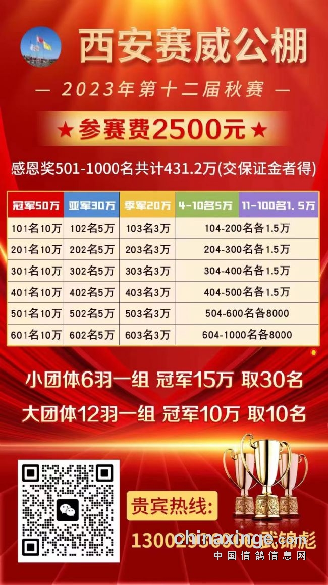 第一,不再给冠军鸽开出天价,不再给前十名鸽开出高奖,把这部分奖金拿出来重新分配到后面名次的随机奖上。比如:宁夏德赢公棚、河南新力公棚、西安赛威公棚他们给101、201、301、401、501、601……名次奖励10万,让更多的小户有了赢大奖的可能性。