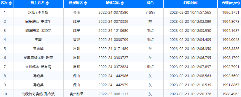 根据归巢数据显示,前384名分速均超过1900米/分,前1500名分速超过1800米/分,当天归巢4900多羽,归巢率达92%。前十名报到数据如下: