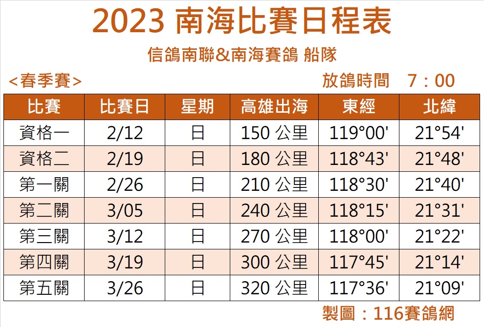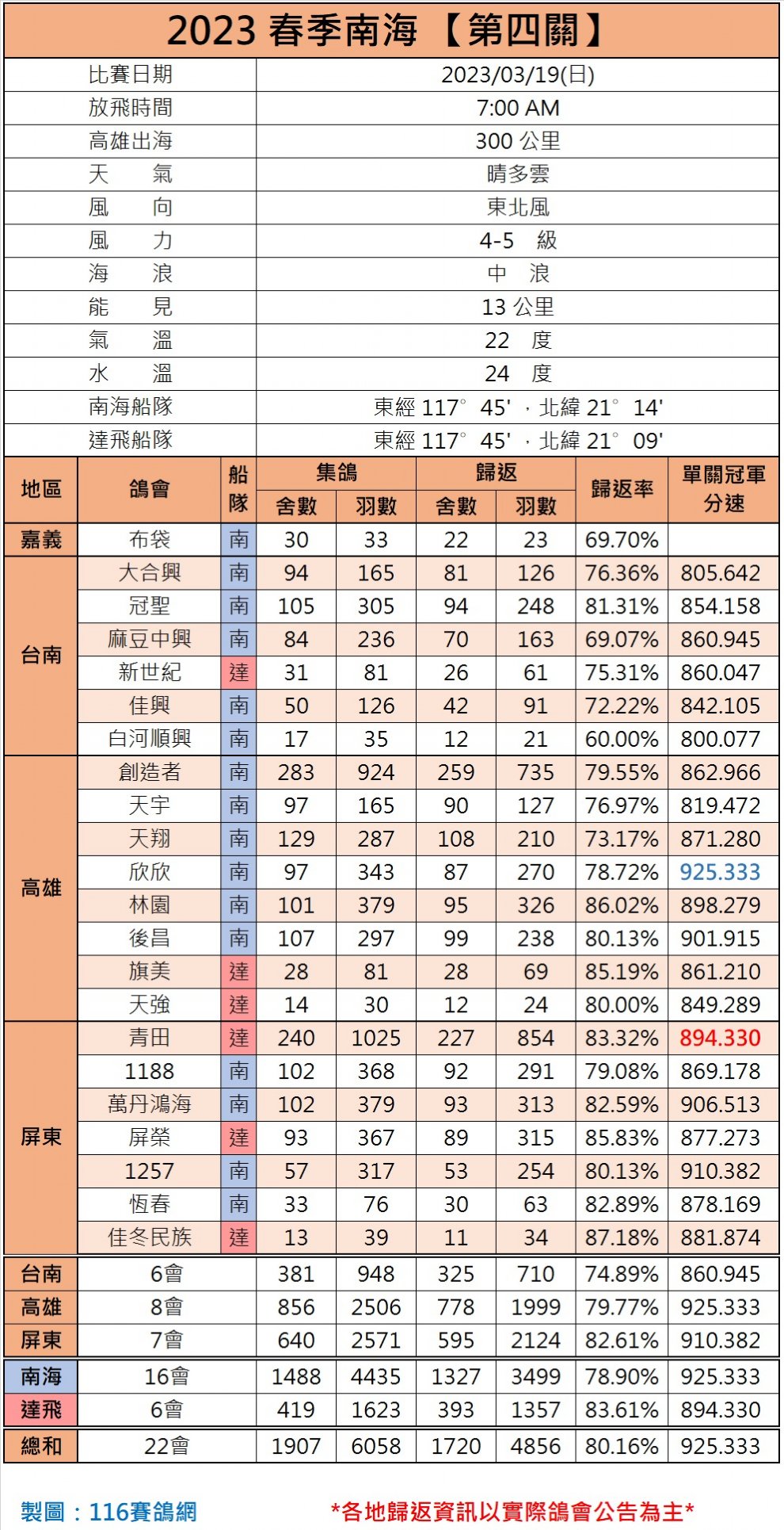 本关的冠军来自高雄的欣欣联合会,分速为925.333米/分,由南海船队司放。达飞船队司放的最高分速则为894.330米/分,来自屏东青田信鸽协会。截至当天归巢4856羽,归巢率80.16%。