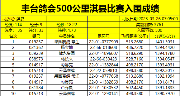 北京市丰台区信鸽协会500公里比赛,于3月26日早上7点05分在淇县开笼放飞,本次比赛共计集鸽3761羽,录取500名。