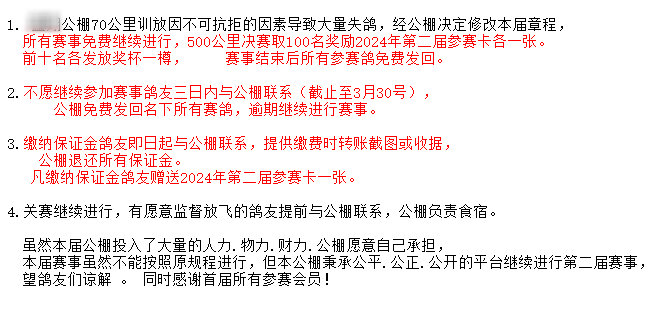 3月27日,山东一家公棚发布一则公告,70公里训放因不可抗因素导致大量失鸽,公棚决定修改本届章程,所有赛事免费继续进行,500公里决赛取100名奖励2024年第二届参赛卡各一张,赛事结束后所有参赛鸽免费发回。