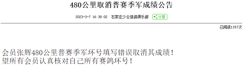 就在刚刚结束的河北少云信鸽俱乐部的免费千公里大赛中,第二羽归巢鸽2022-03-1171180,由于鸽主外出喝酒,导致千公里赛鸽归巢后鸽钟无信号,未按照“千公里规章:参赛鸽归巢后需一个小时内完成上传”的规定,因此千公里亚军成绩被取消。详细报道》