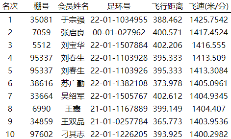 12:02:27,于宗强的2022-01-1034955赛鸽报到,飞行空距388.462公里,分速为1425.7542米/分,位列总排名冠军,获得南区冠军。张启良、刘宝华的赛鸽相继报到,分别获得南区亚军、季军。