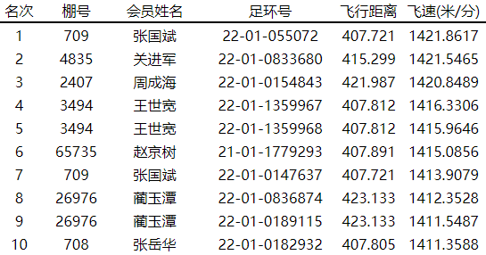 12:16:45,张国斌的2022-01-055072赛鸽报到,飞行空距407.721公里,分速为1421.8617米/分,后来居上反超其他赛鸽,位列总排名亚军,北区冠军。随后,关进军、周成海的赛鸽报到,分别获得北区亚军、季军。