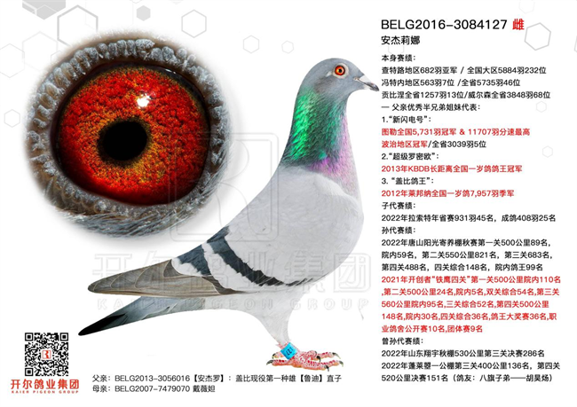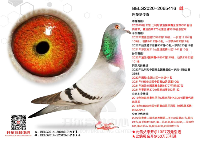 出生于2014年的【阿曼多】自幼鸽就开始征战赛场,到19年5年之间,曾获得2019年波兹南奥林匹克C组比利时KBDB长距离代表鸽冠军,2018年KBDB全国长距离成鸽王冠军(创纪录系数:0.2396%),2018年安格拉姆全国4564羽冠军,2018年冯特内271羽冠军,2018年利蒙治II全国7274羽亚军,2018年利蒙治I全国15789羽30位/全国大区5365羽11位,2017年KBDB全国长距离成鸽王季军,2017年PIPA排行榜2场国家赛比利时最佳长距离赛冠军,2017年利蒙治II全国9162羽亚军/全国大区3339羽冠军等获得地区4个冠军&5个季军奖项,获得全省1、2、5、9、12、18、21、26、49、94位,以及全国大区1、2、10、11、40、44、68、72位!
