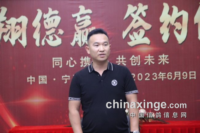宁夏鸽友即兴讲话,今天荣幸地参加了傲翔德赢公棚签约仪式,鸽友心声是希望我们西北未来的公棚,在傲翔鸽业和德赢公棚强强联合之下,在申建峰董事长和苗艳萍总经理的领导下,肯定会打造更辉煌的蓝天。