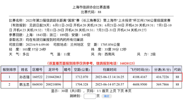 果然,6月13日下午14点16分25秒,上海市1700公里超远程第一羽赛鸽王者归来,是孙志强的210442063赛鸽,飞行空距1712.07公里,分速为416.7226米/分。这一分速也超越了安徽首归鸽的速度(412米/分),暂列本次国家赛的第一名,最终成绩待鸽会公布。
