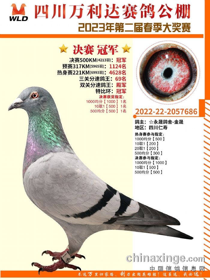 4月15日,四川万利达春棚决赛顺利结束,永晟鸽舍-金晟的2022-22-2057686T灰鸽在4213羽赛鸽中崭露头角,以1035.6418米/分的成绩摘得桂冠。从这羽鸽子的成绩单来看,空距越大,名次越靠前,同时获得双关分速鸽王殿军和特比环冠军,并且为鸽主赢得多项指定。也许好的鸽子需要时间去验证,给它一片天空,它会证明自己的实力。