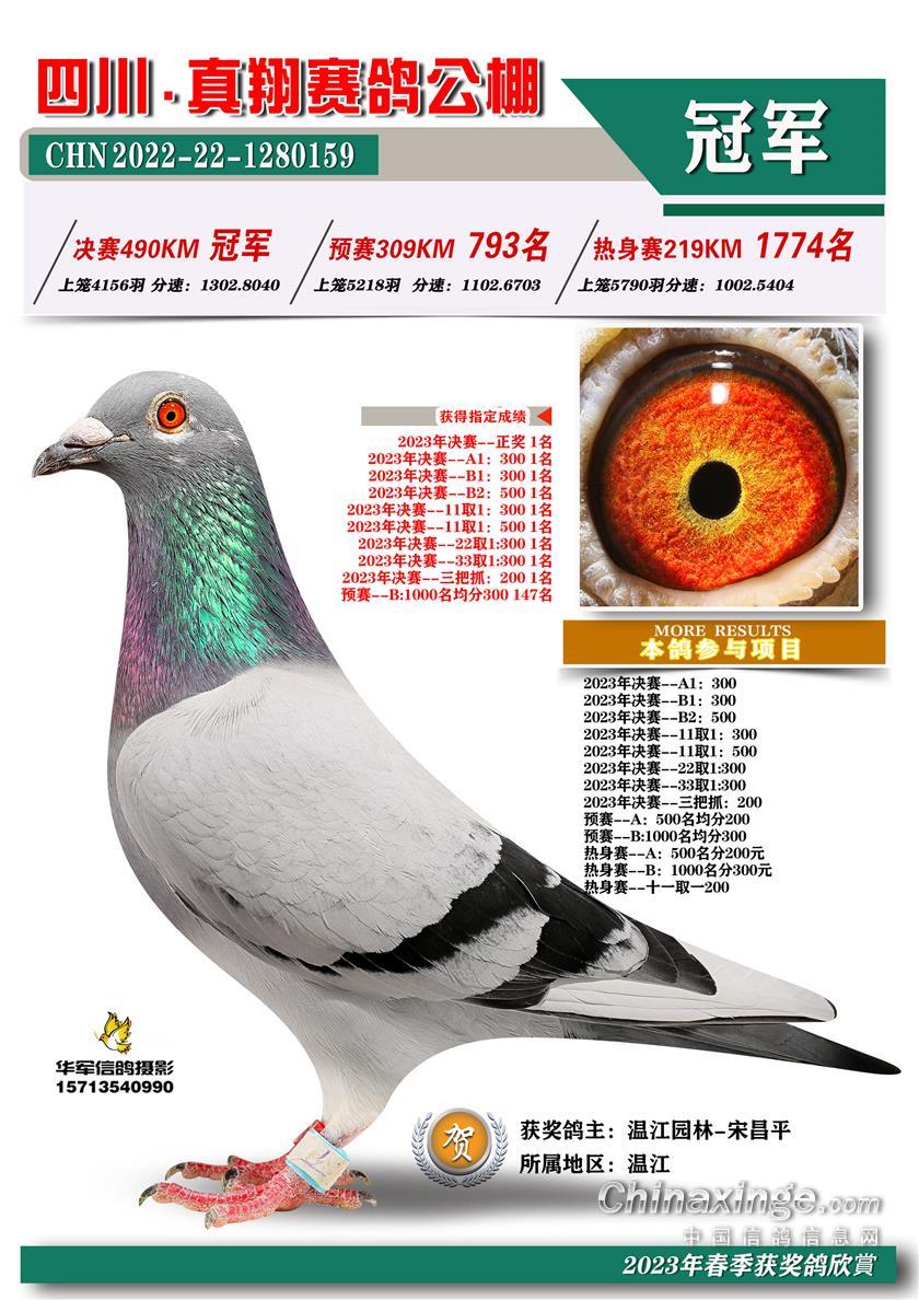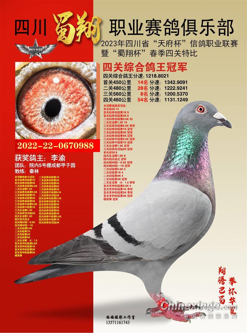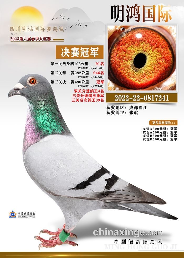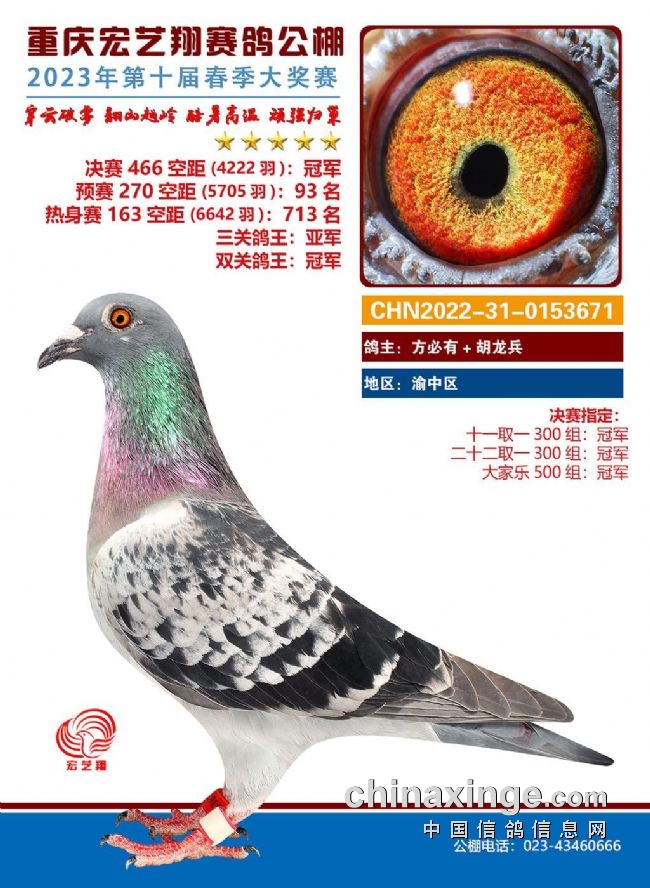 5月11日,随着重庆宏艺翔春棚决赛466公里的落幕,最后的王者也亮相了。方必有+胡龙兵的22-31-0153671雨点以1411.4565米/分的成绩拿下决赛4222羽冠军,以及多项指定。同时凭借热身赛6642羽713名、预赛5705羽93名拿下双关鸽王冠军和三关鸽王亚军。靓鸽照片上“穿云破雾、翻山越岭、酷暑高温、顽强归巢”16个字十分醒目,不怕路难只怕畏难,它用实力赢得属于自己的荣誉。