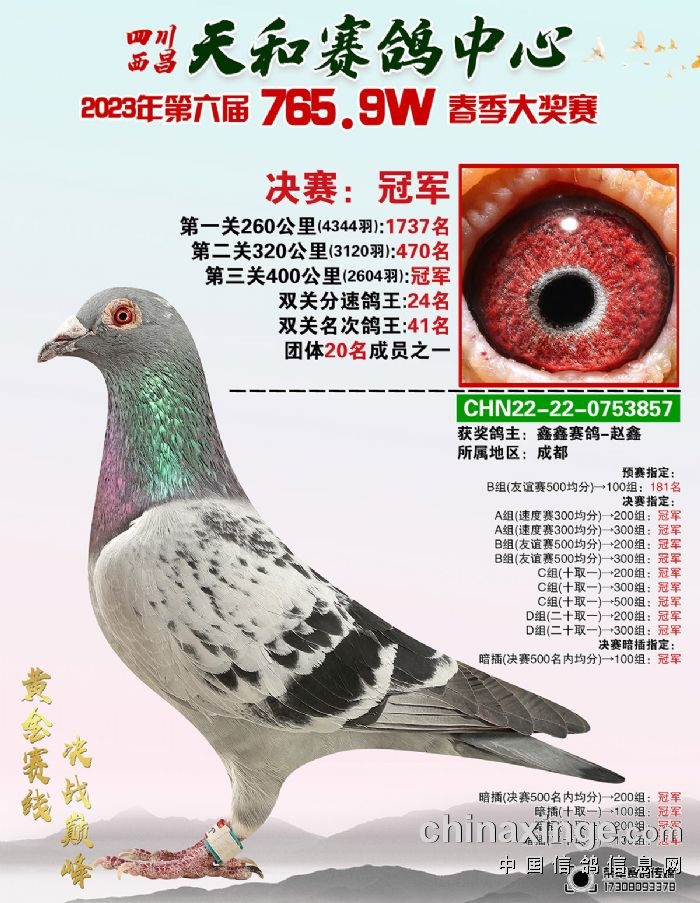 从2018年第一届春赛开始,到2023年第六届春赛,四川西昌天和的总奖金从最初的520W,每年递增到如今的765.9W,用行动表明了办赛的诚意和实力。收鸽近万羽,决赛上笼2604羽,能冲到绝杀关的鸽子想必都有几把刷子。鑫鑫赛鸽-赵鑫的22-22-0753857赛鸽不鸣则已一鸣惊人,一跃拿下决赛400公里冠军,同时拿下双关分速鸽王24名以及多项指定,鸽主果然好眼力。