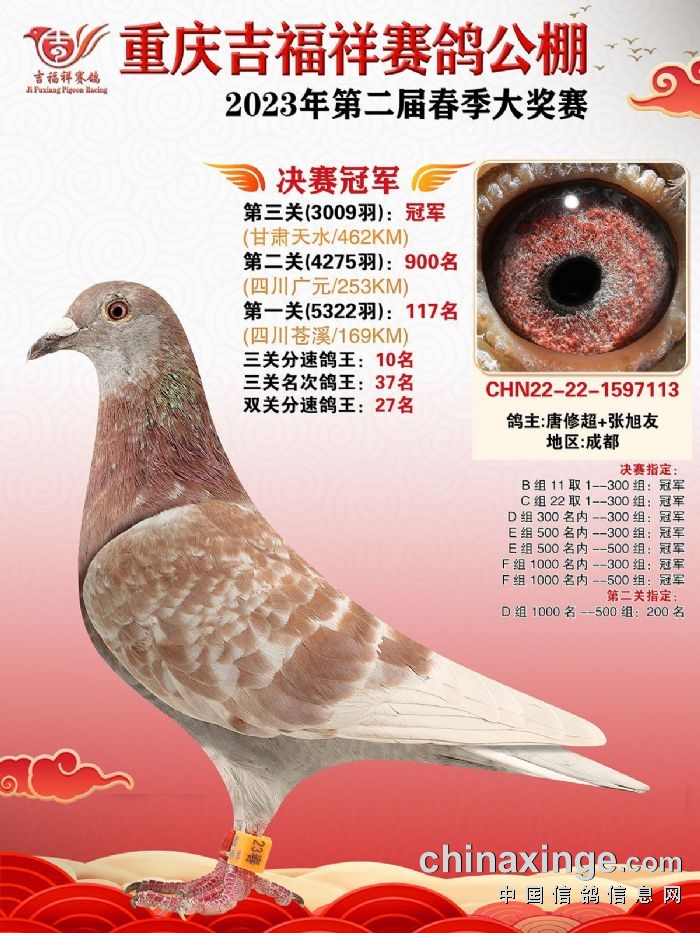 瞧瞧!在一众冠军鸽中,不得不说它有点抢眼,它是一羽降鸽,拿下重庆吉福祥2023年第二届春赛冠军,环号22-22-1597113,它前两关的成绩不突出,分别是117名、900名,但是凭借相对稳定的发挥,获得三关名次鸽王37名、三关分速鸽王10名。