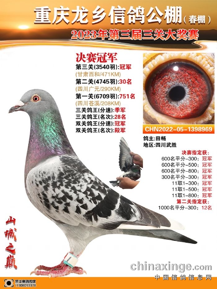 重庆龙乡2023年第三届春赛收鸽超1.2万羽,经过十几次训放以及三关正赛的锤炼,2369羽赛鸽在决赛关顺利归巢。田畅的一羽2022-05-1398969雨白条飞出1438.9458米/分,成为本场比赛的佼佼者,拿下多项指定。另外,它凭借一关751名、二关30名、三关冠军的成绩获得双关鸽王分速冠军、三关鸽王分速季军。