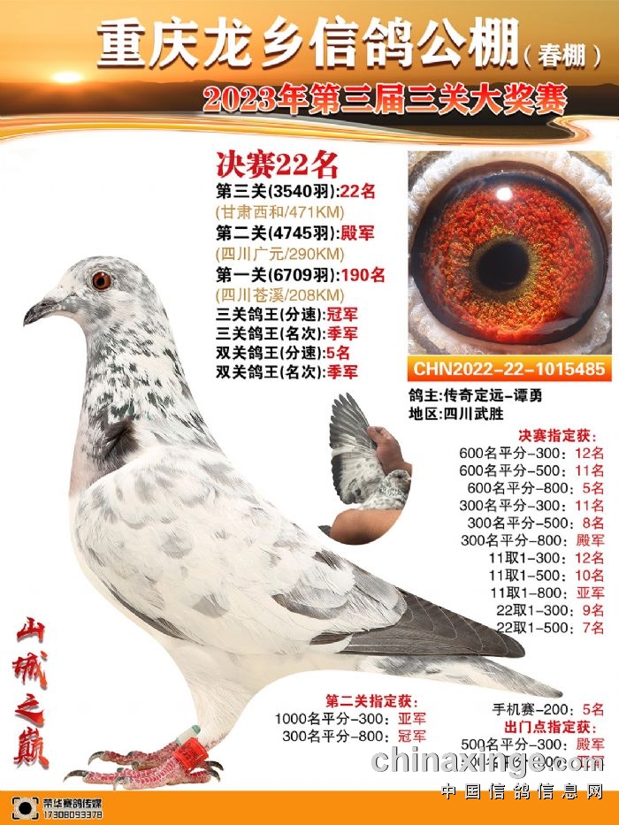 还有一羽鸽子凭借自己的实力引起关注,它是本届决赛的22名,传奇定远-谭勇的2022-22-1015485麒麟花,这羽鸽子在第二关发挥出色,荣获殿军,最终获得双关鸽王分速5名、三关鸽王分速冠军。