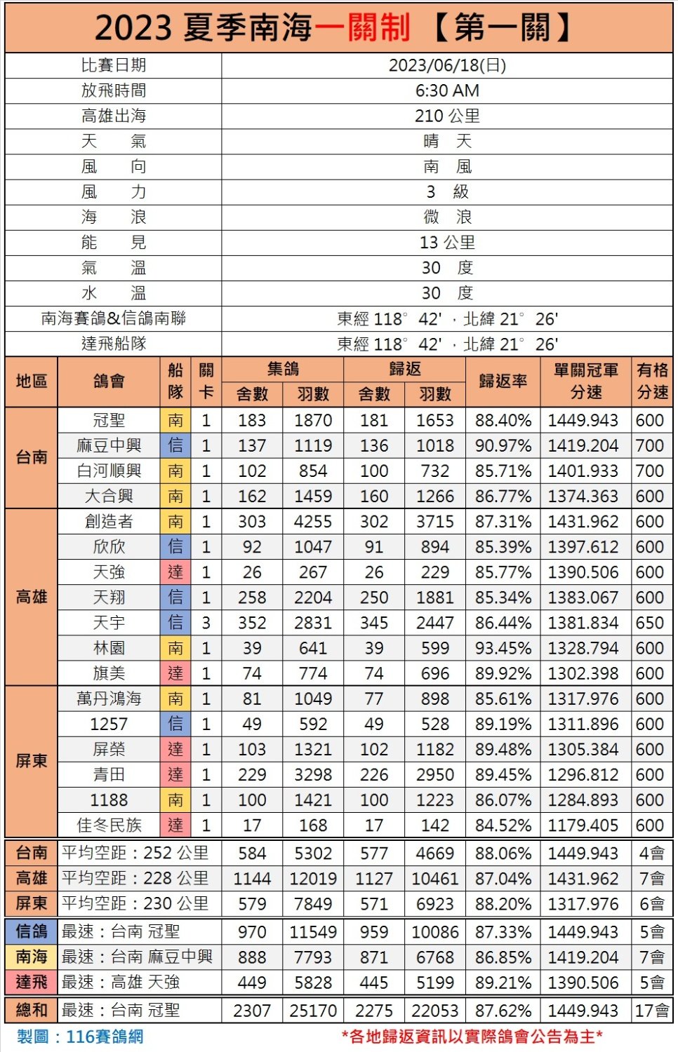 6月18日,2023年中国台湾南海夏季海翔鸽王赛进入正式赛阶段。第一关210公里比赛于当天上午6点30分开笼,共计17家鸽会、2307舍、25170羽赛鸽参与竞翔。