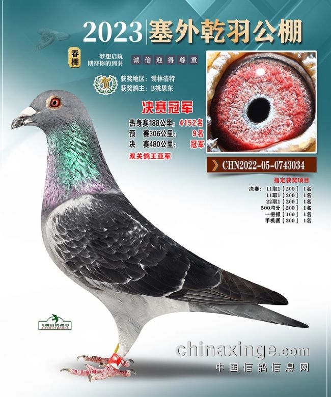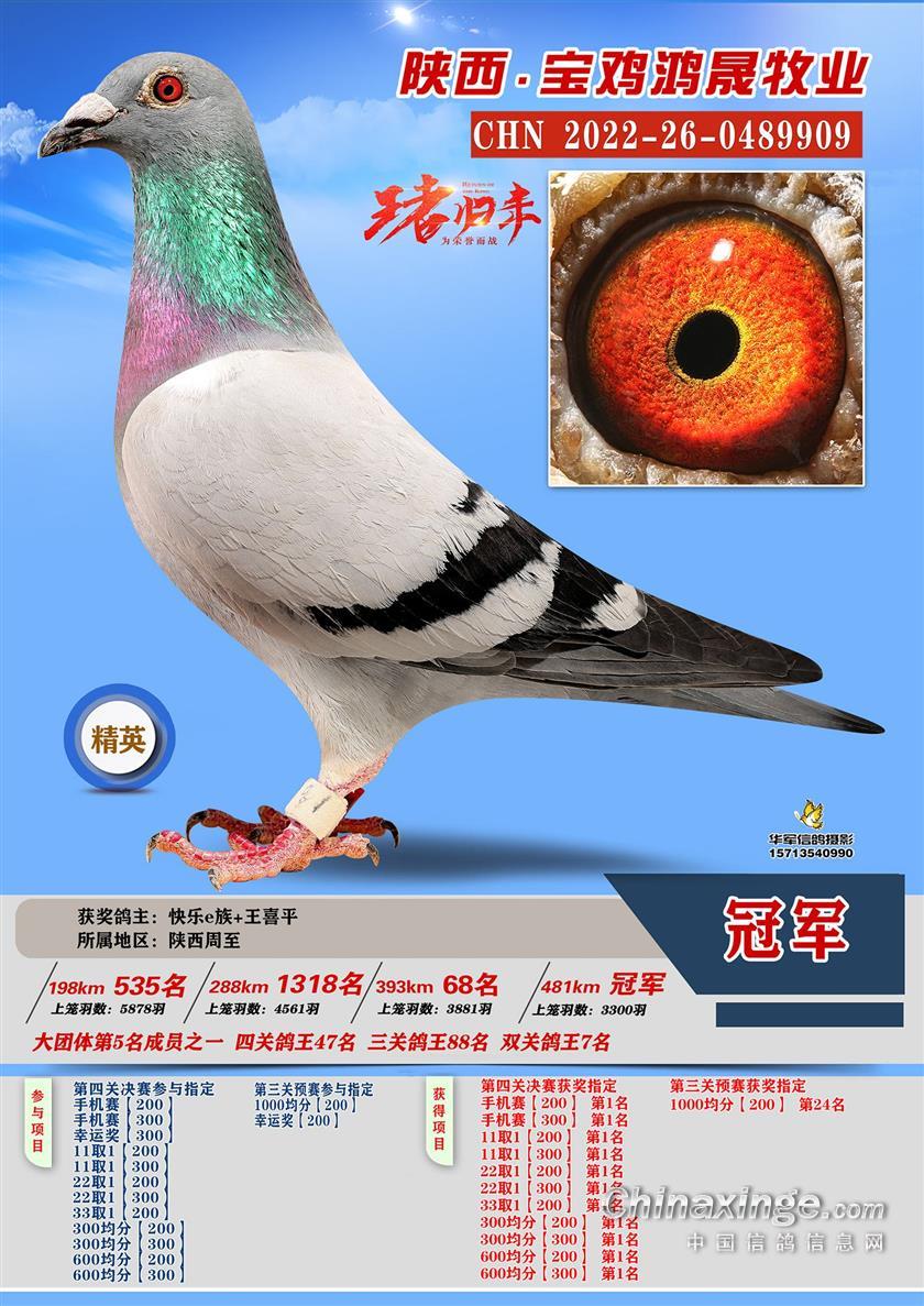 陕西鸿晟2023年举办首届春赛,收鸽近万羽,收费站上笼六千多羽,经过一站站的磨练,有3300羽赛鸽完成挑战,进击决赛。最终2022260489909赛鸽为它自己、也为它的主人快乐e族+王喜平赢得冠军头衔以及多项是指定。同时,它以一关535名、二关1318名、三关68名、四关冠军的成绩赢得双关鸽王7名、三关鸽王88名以及四关鸽王47名。