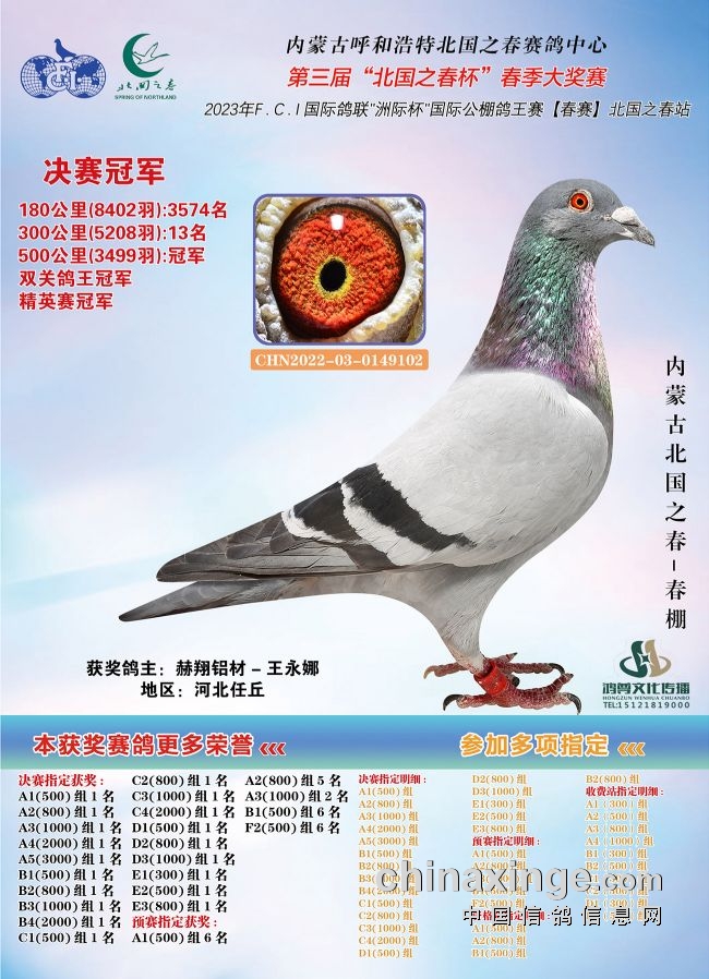 内蒙古北国之春第三届春赛落下帷幕,鸽主赫翔铝材-王永娜成了最大的赢家,其名下赛鸽2022-03-0149102获得决赛冠军、双关鸽王冠军、精英赛冠军以及多项指定,是妥妥的大赢家。