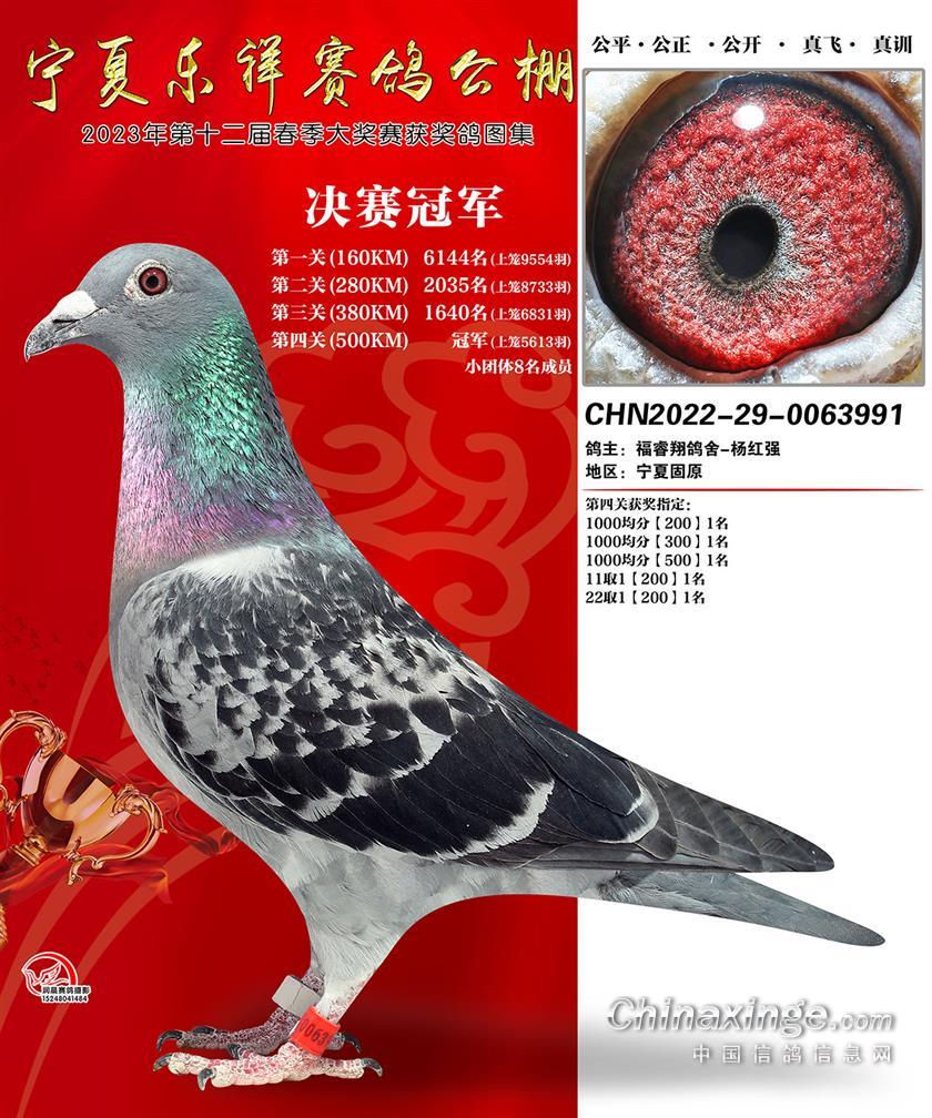 时光匆匆,宁夏乐祥春棚已走过十二载,风里雨里,沉淀自己。2023年宁夏乐祥的决赛冠军上演了一场“逆袭秀”,从6144名、到2035名、再到1640名,最后荣登第一宝座。它就是福睿翔鸽舍-杨红强的2022290063991雨点鸽,在决赛5601羽中一举夺冠。果然,令人害怕的不是对手多强,是他在偷偷变强。