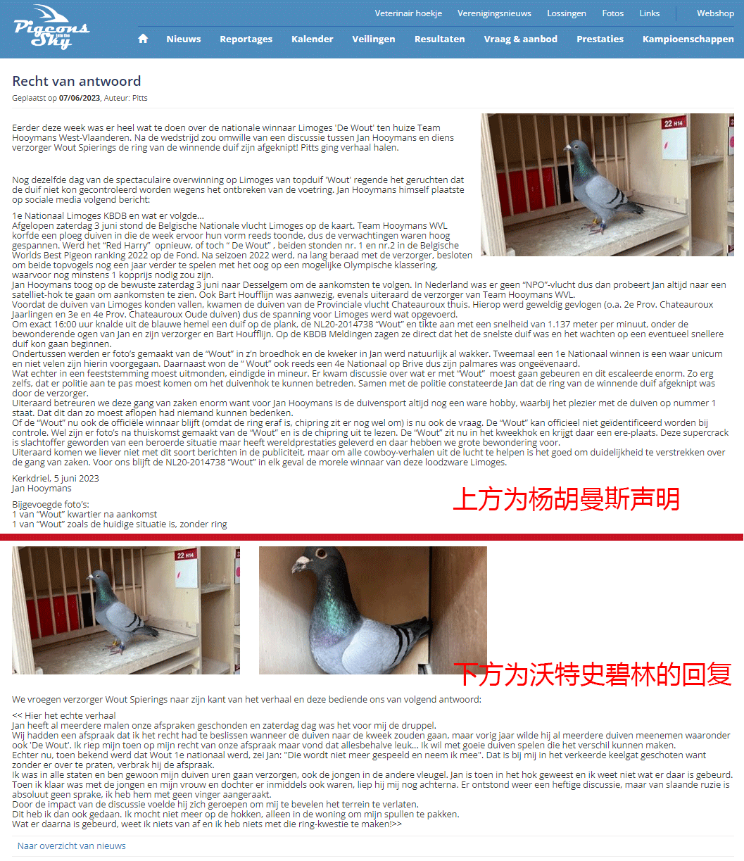 不过,今年的第一场利蒙治比赛中,杨胡曼斯战队的“冠军鸽被剪环”事件,更让人印象深刻。本周第二场利蒙治国家赛,他们能否赢得高位或冠军,自证实力,令人期待。