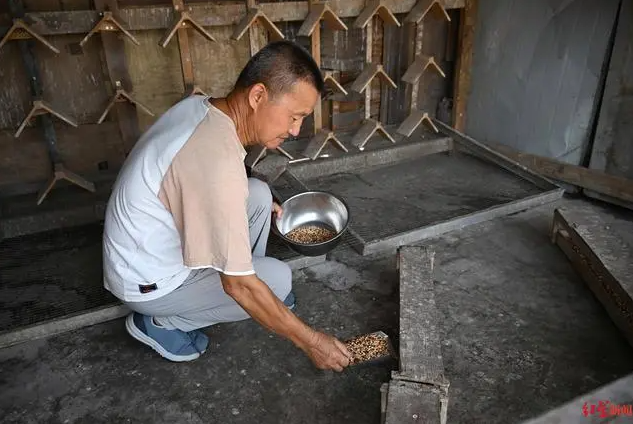 他非常细致,上午的饲料主要是小颗粒粮食(包含高粱、麦子、谷子、红花籽、油菜籽等七八种原料)和保健砂(矿物质饲料),晚上则是大颗粒粮食(包括豌豆、玉米等)和保健砂。为了保证这些原料的品质,他从不网购,都是去市场现场挑选。当他顶着红火大太阳,把所有的粮槽加满后,汗水已经渗湿了他衣服。