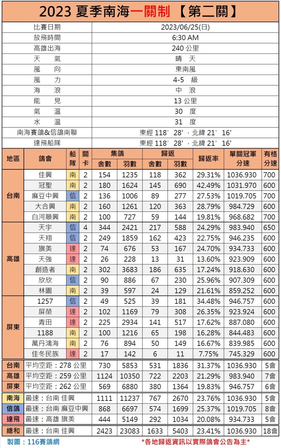 比赛当天,超九成赛鸽凯旋!冠军鸽来自台南佳兴鸽会,分速1545.009米/分。虽然比赛空距为270公里,但台南、高雄、屏东三个地区的平均空距均超过270公里,分别达到308公里、289公里、292公里。第三关结束,挑战还未结束,期待归来的这4931羽赛鸽在后续的比赛中再创佳绩。