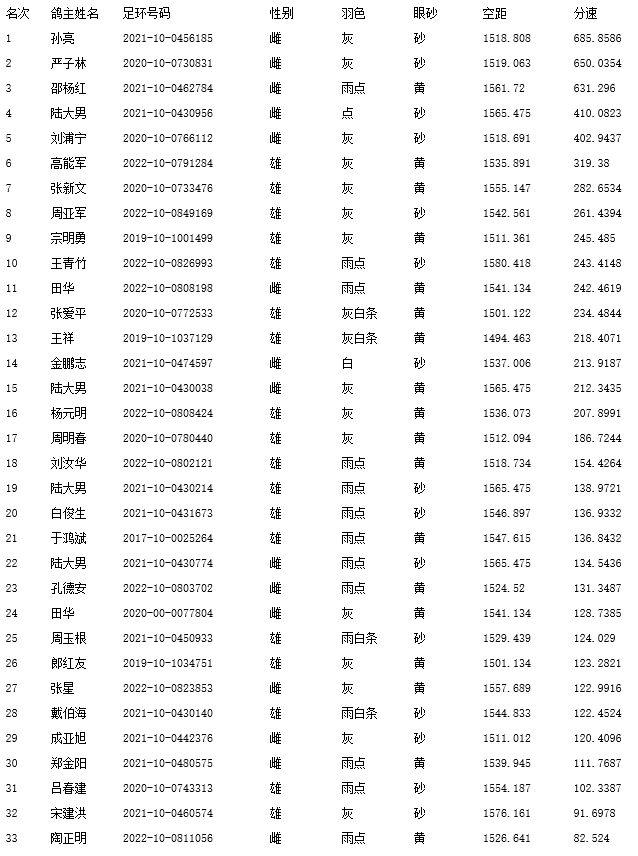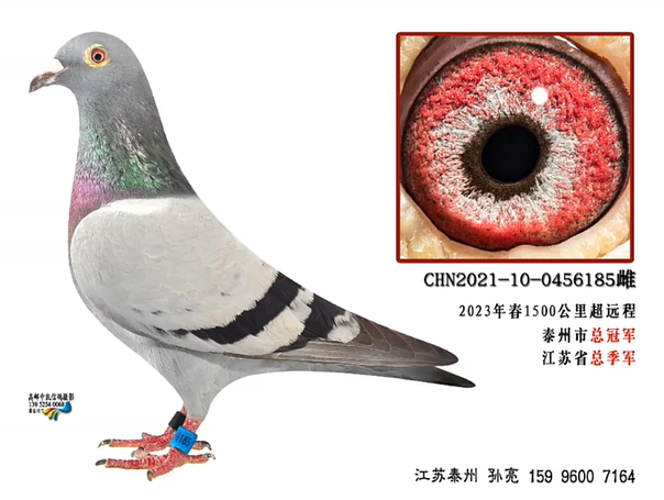 放飞第三天(6月10日)中午12点50分27秒,泰州市第一羽归巢鸽报到,是孙亮的2021-10-0456185灰雌,飞行空距1518.808公里,分速为685.8586米/分,荣获泰州市冠军。凭借这一分速,也暂排江苏省超远程1500公里级别季军。