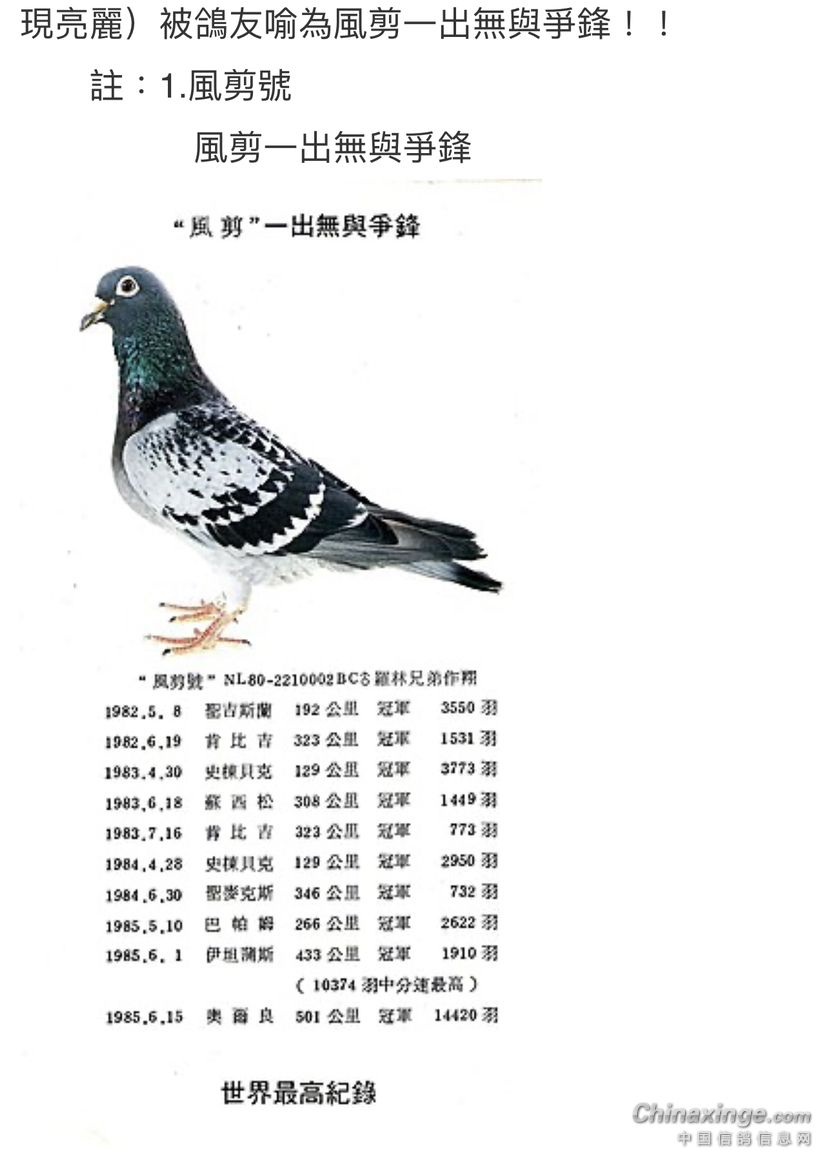 “风剪号”名流青史,已成为“世代口耳相传”的不出世大铭鸽,但其下代依然为喜爱的鸽友建功立业,其杰出表现流传万代而生生不息!
