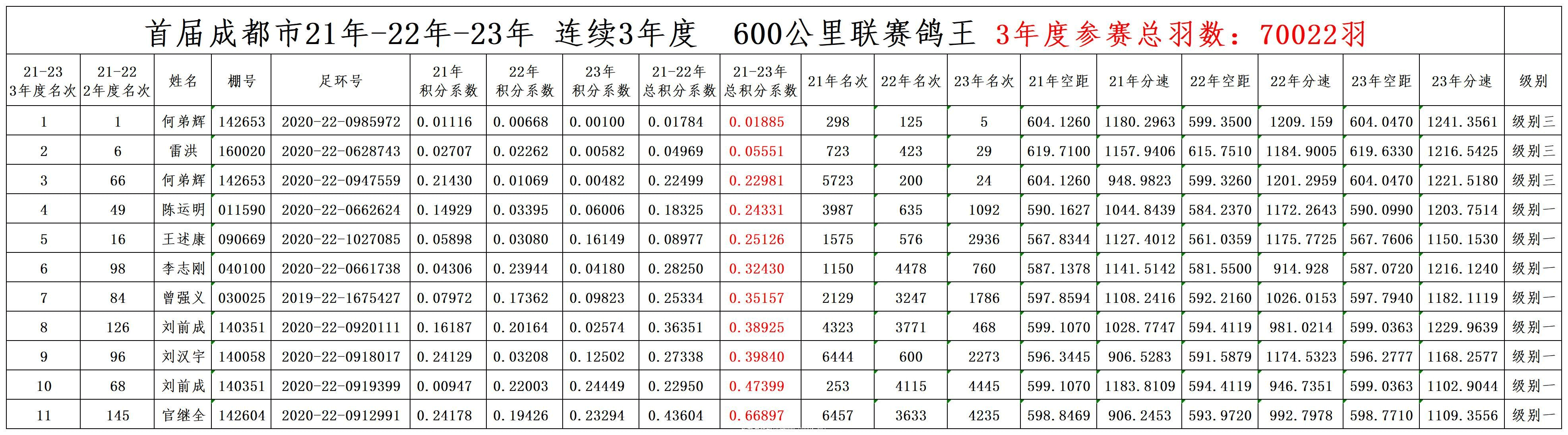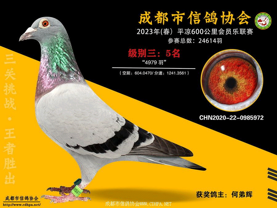 成都市信鸽协会600公里联赛年度鸽王成绩揭晓,何弟辉的2020-22-0985972黄眼灰鸽在70022羽赛鸽中脱颖而出,分别以0.00769、0.01885的积分系数,囊获2022-2023、2021-2023年度两项鸽王冠军头衔。