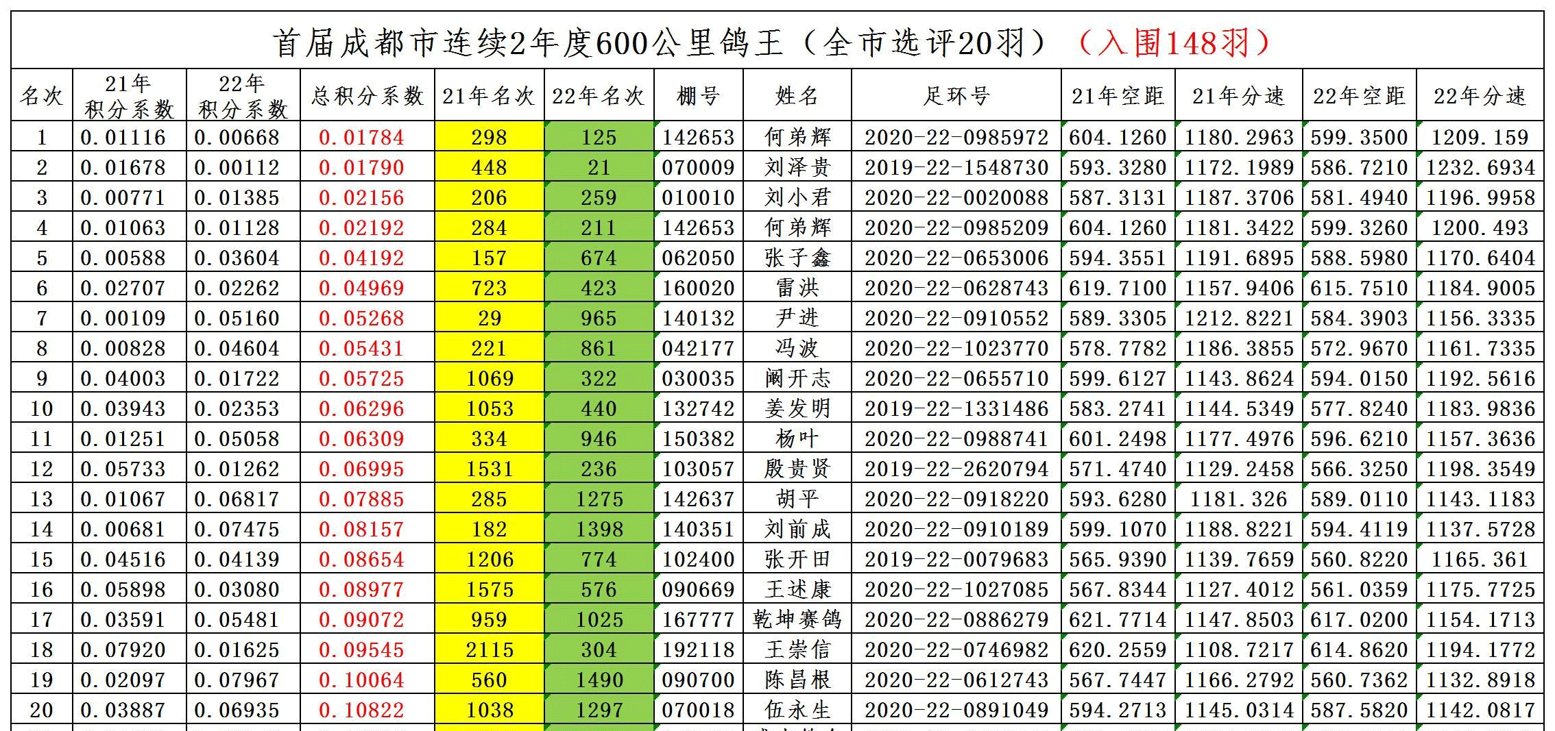 不仅如此,2022年成都市首届600公里年度鸽王评选(2021-2022年)中,这羽鸽子也是获得鸽王冠军,积分系数为0.01784。同一羽赛鸽,连续三年飞600公里,均高位入赏,拿下三项鸽王冠军头衔,真硬!