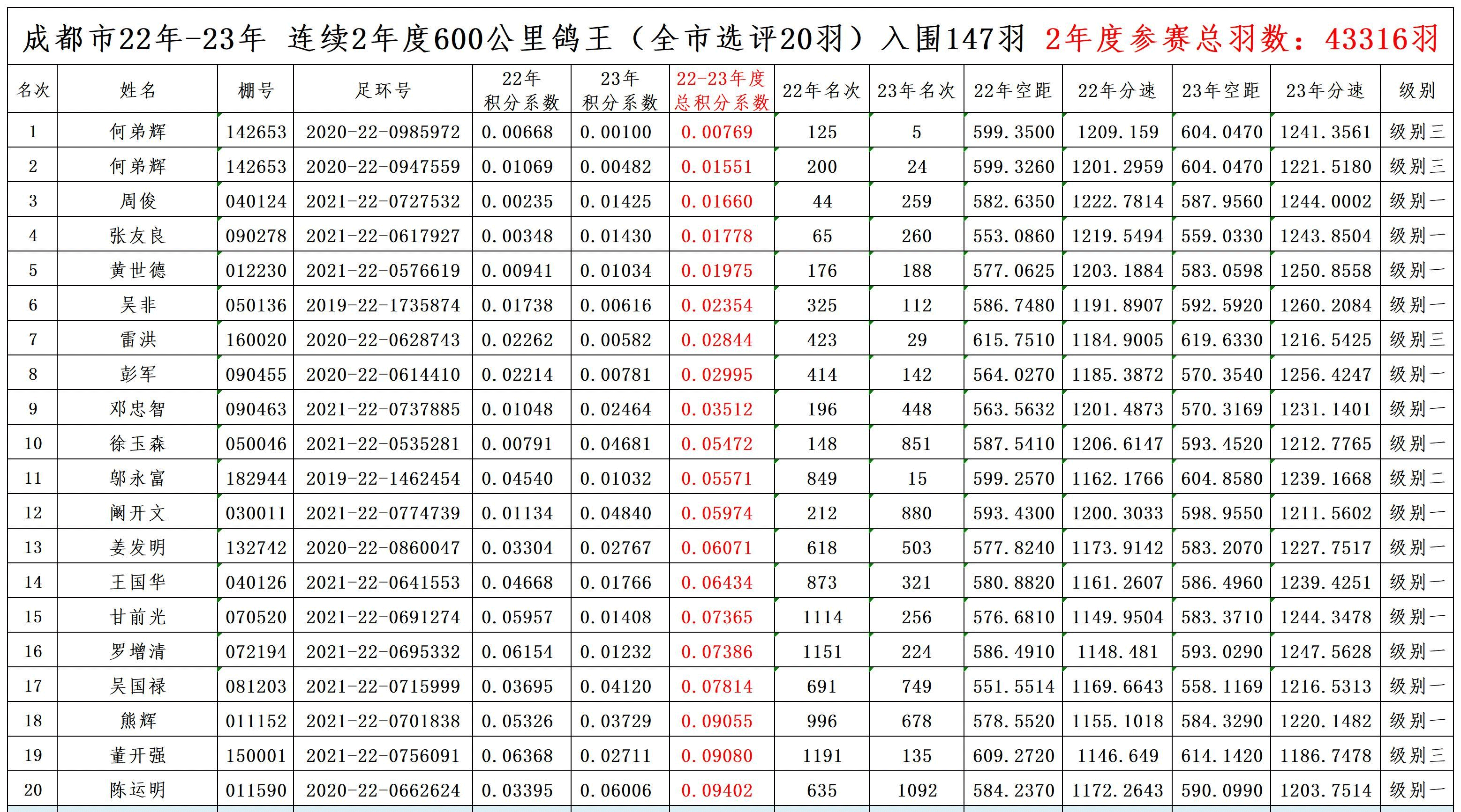 目前,成都市信鸽协会已公布了部分鸽王初步成绩,其中2022-2023年度600公里鸽王,全市参评参赛鸽总羽数43316羽赛鸽,有147羽赛鸽入围,录取前20名。2021-2023年度600公里鸽王,全市参评参赛鸽总羽数70022羽,今年决出了11羽赛鸽。