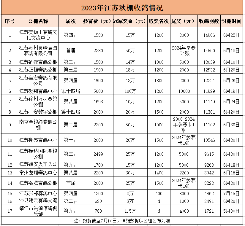 每年比赛时节,都会有来自全国各地的鸽友汇聚在此,彼此交流养鸽经验,参加春秋公棚大赛,这也让江苏的公棚每年都收鸽满满。六月下旬,多家秋棚便提前宣布封棚,甚至部分秋棚已进入到家飞阶段,让我们一起看看今年江苏秋棚具体的收鸽情况吧!