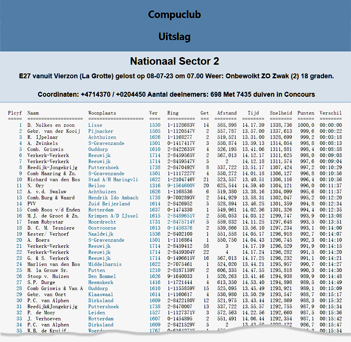 需要说明一点,本场国家赛前5名都来自于南荷兰省中、西部,这和当天南荷兰省的东南风向有很大关系,归巢的鸽群全被吹向西北方向,再绕回东部归巢,这导致东部鸽友成绩整体落后于中西部鸽友。