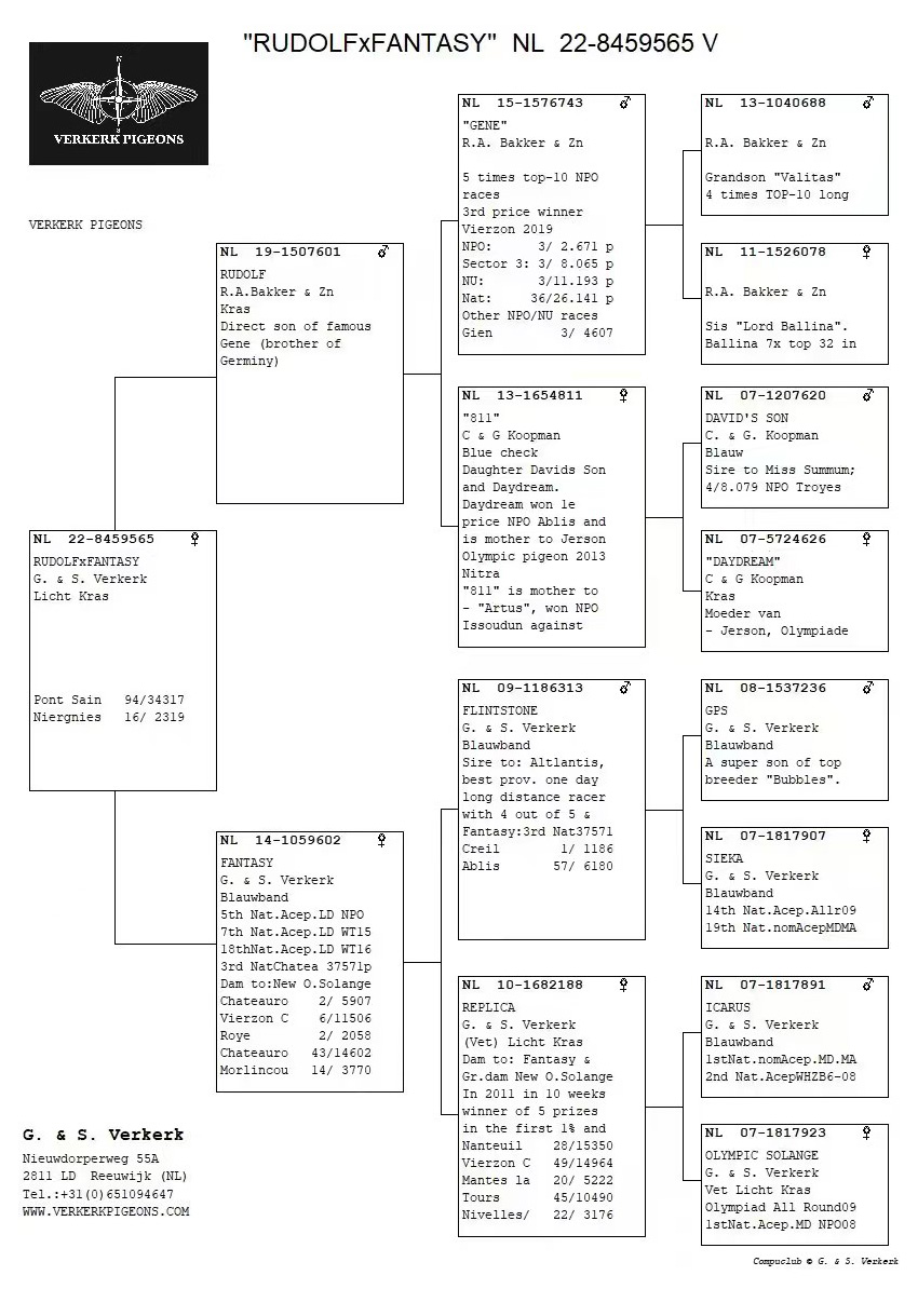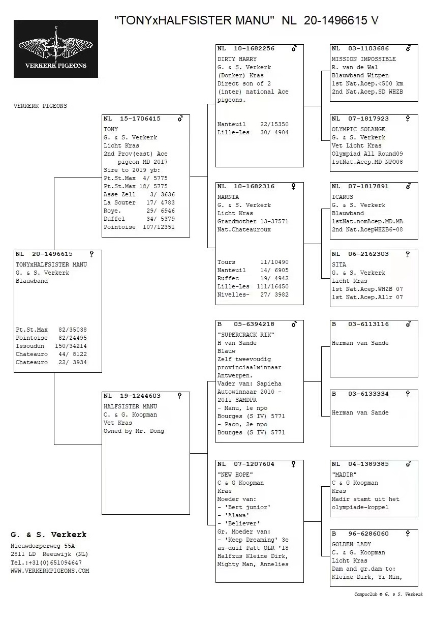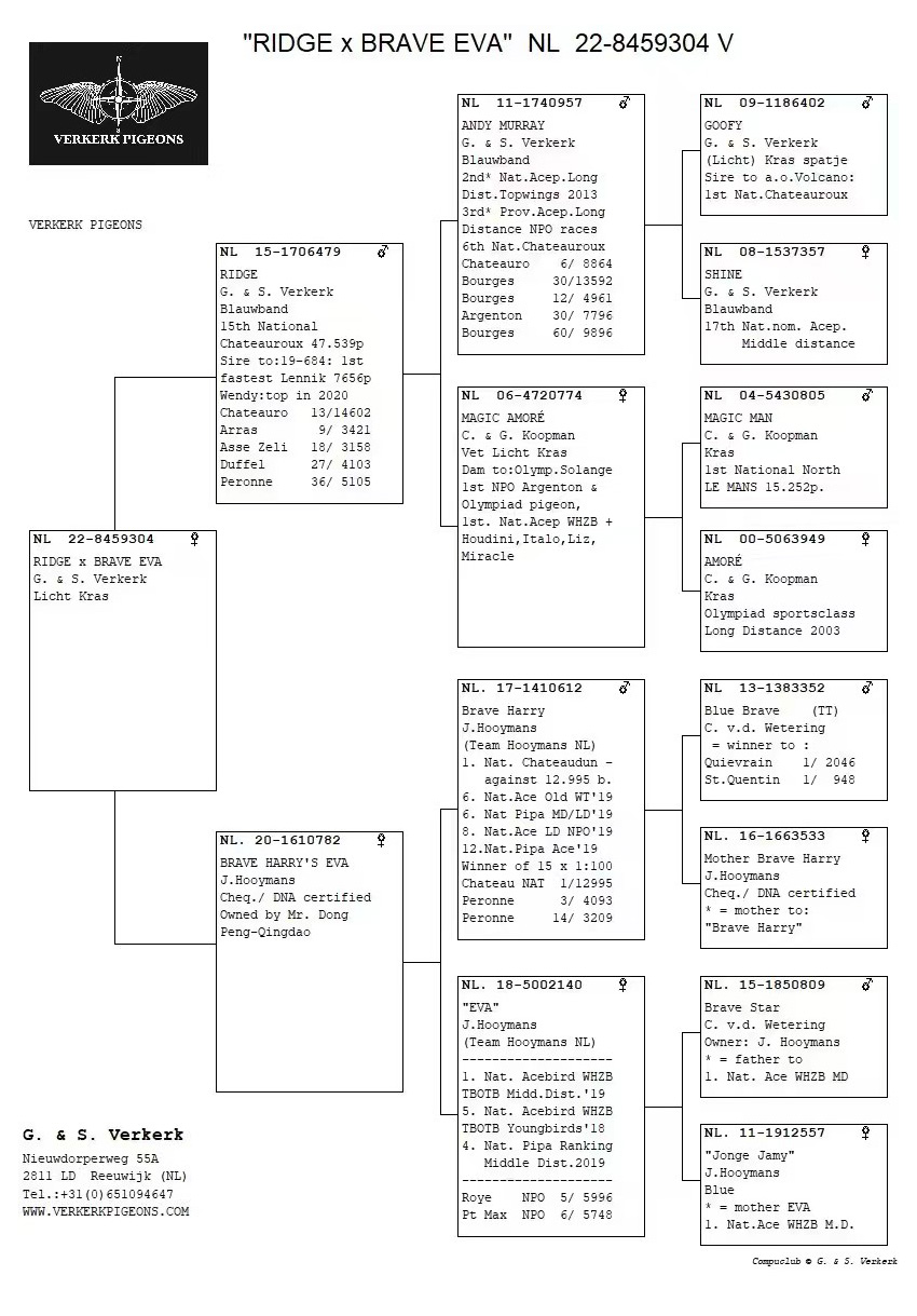 杨·胡曼斯“勇敢哈利”ד夏娃”直女,父亲“勇敢哈利”获得查特顿12995羽国家赛冠军、WHZB-TBOTB老鸽全国鸽王6名等。
