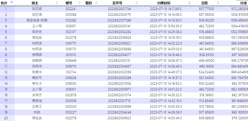 3分钟之后,谢艺海的2023832004175赛鸽报到,飞行507.65公里,分速为1006.9155米/分,赢得亚军。下午14点16分36秒,勇豪鸽舍-郭勇的2023832007086赛鸽报到,飞行509.902公里,分速为1006.4954米/分,赢得季军。