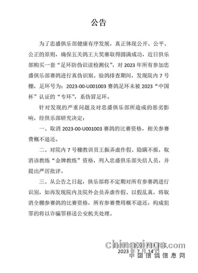3、从公告之日起,俱乐部将不定期对所有参赛鸽进行识别,若发现院内、外会员弄虚作假,以假乱真,将取消全棚参赛鸽比赛资格,所有参赛费不予退还,构成犯罪的将以诈骗罪移送公安机关处理。
